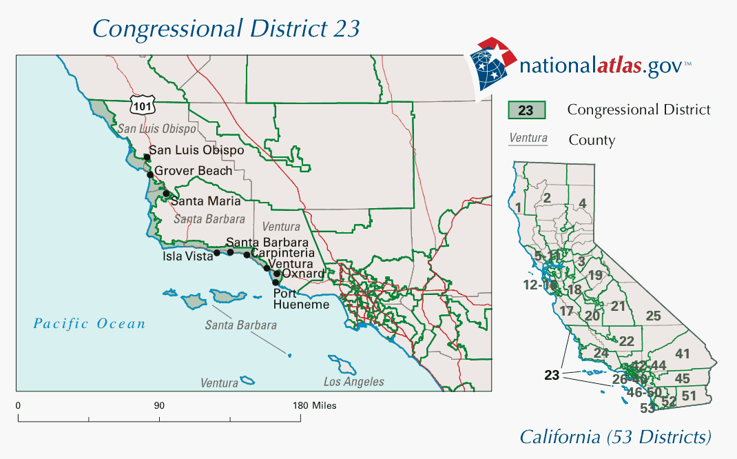 Let's look at another example. Historically, there have been a few long and skinny districts that would fail most tests for compactness. From 2003 to 2013, for instance, California's 23rd district covered hundreds of miles of Pacific coastline, but barely any land farther inland: